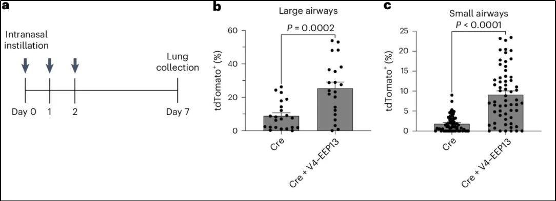 2)效果:在体外实现多种细胞(包括原代细胞)的高效低毒递送,在体内成功完成小鼠肺部Cre重组酶mRNA/蛋白递送,且对大/小气道上皮细胞(纤毛细胞、杯状细胞等)均有转染效果 [6](图1)。