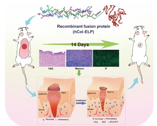 类人胶原蛋白(hCol)是伤口愈合的关键成分,但天然hCol敷料在体内稳定性差。研究人员开发了hCol-ELP重组融合蛋白:既保留hCol的生物活性,又因ELP的引入形成紧密均匀的层状结构,稳定性显著提升。在小鼠皮肤伤口模型中,hCol-ELP可减轻炎症反应、促进胶原蛋白再生,加速伤口愈合并减少瘢痕形成 [7](图2)。